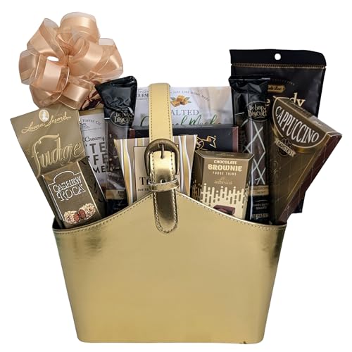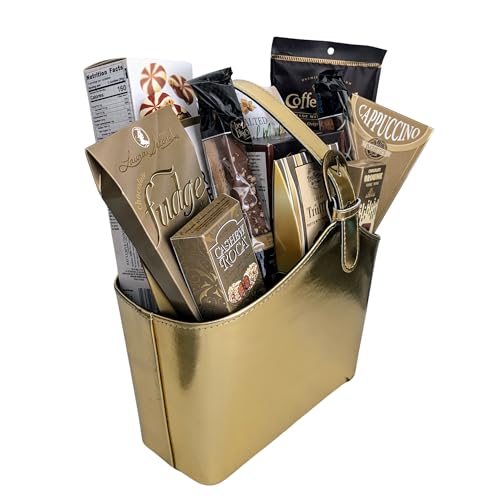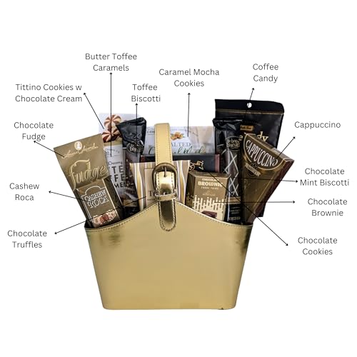 Chocolates & Cookies Gift Basket in Golden Faux Leather Tote – Business Gift, Thank You Gift Basket, Thanksgiving Gifts, Christmas & Holiday Gifts, Chocolate Gift Basket, Snack Foods Gift Basket, Gourmet Food Gifts, All Occasion Gift Basket