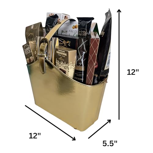 Our luxurious gift of spectacular chocolates and cookies in a reusable Gold Tote is sure to delight recipients and leave a lasting impression! The rich, glossy gold faux leather tote bag sets this gift apart from the others. Not only will the recipient enjoy the gourmet selections within, but the reusable golden tote also serves as a sophisticated piece of home or office storage decor, creating a lasting memory for years to come.