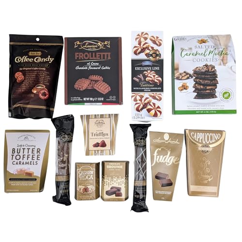 This gift includes: 1 – Chocolate Mint Biscotti 2.25 oz, 1 – English Toffee Biscotti Biscotti 2.25 oz,1 – Tuttino Cookies with Chocolate Cream 5.29 oz, 1 – Froletti Chocolate Cookies 3.52 oz, 1 – Barista’s Best Cappuccino 1.1 oz, 1 – Coffee Candy 5.6 oz, 1 – Caramel Mocha Cookies 6 oz, 1 – Truffettes De France Chocolate Truffles 0.5 oz, 1 – Butter Toffee Caramels 2 oz, 1 – Cashew Roca 0.4 oz, 1 – Chocolate Brownie Fudge Thins – 1 oz, 1 – Chocolate Fudge 1.4 oz