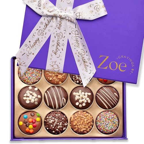 CRAVINGS BY ZOE Happy Birthday Chocolate Covered Cookie Gift Box | 12 Count | Kosher Gourmet Belgian Chocolate Treats Food Gift Basket | Birthday Gifts for Women & Men Mom Dad Husband Wife Kids