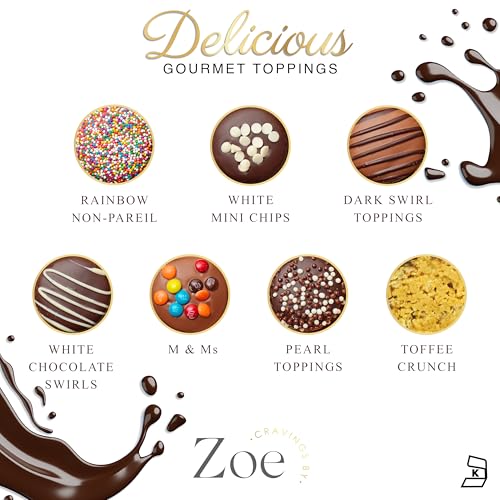 Delicious Gourmet Toppings – Cravings by Zoe’s happy birthday cookies have a delicious combination of flavors and mouthwatering toppings. Each gourmet cookie is creamed and generously dipped into dark chocolate or milk chocolate. This assortment includes (6) dark chocolate cookies with a selection of white mini chips, white swirls and pearl toppings (6) milk chocolate cookies with a variety of M&Ms, rainbow nonpareils, toffee crunch and dark swirl toppings.