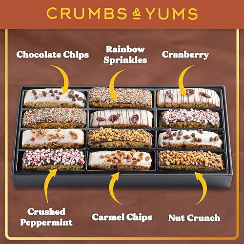 GOURMET CHOCOLATE-COVERED BISCOTTI: Crumbs & Yums Black Basket features 12 handcrafted biscotti in six exquisite flavors: caramel chips, chocolate chips, nut crunch, dried cranberries, crushed peppermint, and rainbow sprinkles, offering a luxurious and rich treat.