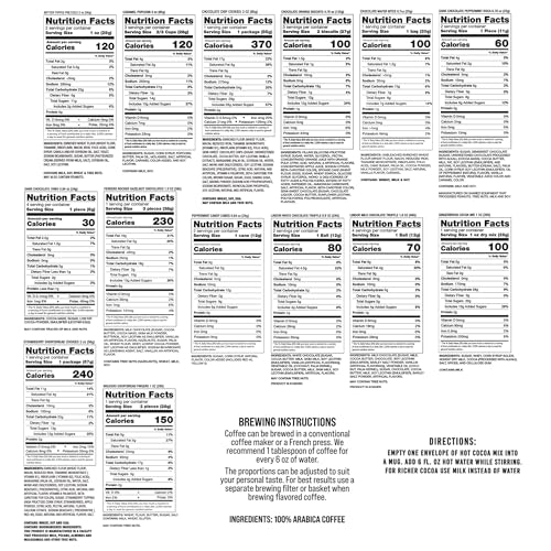 Includes wooden crate, two ceramic coffee mugs, French roast coffee, gingerbread cocoa mix, caramel popcorn, Lindt Lindor chocolate truffles, Ferrero Rocher chocolate, toffee pretzels, and several types of cookies
