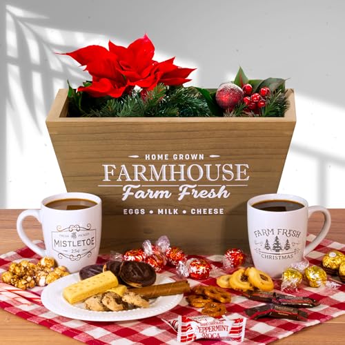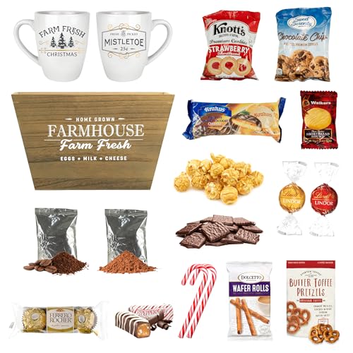 This 17 piece farmhouse wood crate Christmas gift basket will impress any one that receives it. It includes a mix of different holiday season food treats, coffee, and mugs, and comes in a brown wooden crate that has the sentiment “Home Grown Farmhouse Farm Fresh Eggs – Milk – Cheese.” Overall the gift basket measures about 23″ tall x 7 1/2″ deep x 14 1/2″ wide. The perfect gift for friends, family, colleagues, and any loved ones that enjoys the good things in life such as coffee and food. Items included in the gift basket are: Brown wooden crate; Two Christmas farm theme ceramic mugs; Chocolate chip cookies (2 oz); Everton Toffee butter toffee pretzels (2 oz); Walkers shortbread cookies (1 oz); Boldbrew gingerbread cocoa mix (1 oz); Boldbrew French roast ground coffee (1 oz); Two peppermint candy canes; Lindt Lindor chocolate truffles (2.4 oz); Jaffa Cakes cookies (4.76 oz); Caramel Popcorn (3 oz); Brown and Haley Almond Roca Candy (.78 oz); Ferrero Rocher hazelnut chocolate (1.3 oz); Knotts Berry Farm strawberry shortcake cookies (2 oz); Dolcetto Petites chocolate wafer bites (.53 oz); Dark chocolate thins (.84 oz)