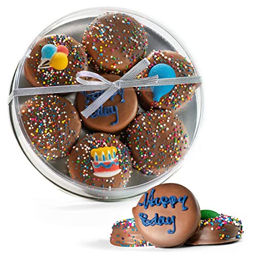 Happy Birthday Milk Chocolate Covered Sandwich Cookies, Custom 7 Pc. Blue Gift Basket, Fresh Hand Decorated Assortment, Sweet Multi-Layered Sandwich Treats for Kids and Adults