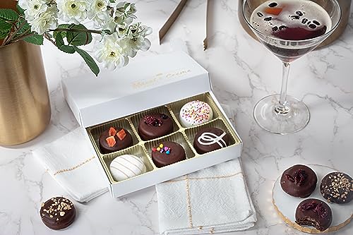 READY TO GIFT: Give the ultimate gift of giving with these beautiful eye popping chocolate gift box. Hazel and Creme chocolates have a delicious combination of flavors and textures. Each cookie is doubled creamed and generously dipped into dark chocolate topped with mouth watering flavorful toppings.