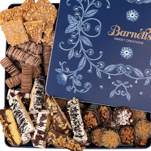 VARIETY SELECTION – our deluxe cookie collection features four (4) different styles of gift confections: artisanal sandwich cookies, coated wafer rolls, garnished biscotti and sweet skids, all uniquely decorated with rich coatings and garnished with twelve (12) yummy toppings for variety, flavor fun which makes this a winsome most delicious confection tray. The most efficient basket sets of safe to eat gifting can also be found in our Barnett’s Quality Product Line.