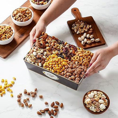 Delight any recipient with this edible nuts gift basket treat assortment: beautifully packaged and ready for gifting. The Broadway Basketeers Gourmet Food Gift Basket caters to many occasions and recipients because it is filled with delicious, gourmet food and snacks. Plus it’s a convenient way to share warmth and love. Our premium food gifts are a best seller because they are an easy gift to send to loved ones and friends, near or far. A unique gift, this assortment contains scrumptious treats and savory snacks for anyone who loves nuts and trail mixes. You’ll receive an assortment of snacks, all selected for quality and taste by our experts. Our bestselling selection includes favorites for all ages, making it ideal for any holiday, party, or occasion. Packaged in a beautiful metal tin basket, each gift is hand-assembled and tied with a beautiful occasional ribbon or bow. This makes a delightful present for mom or dad, grandma or grandpa, sisters and brothers, families, groups, boss, teacher, neighbor, friends, and acquaintances.