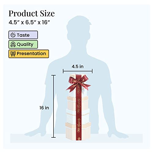 This sympathy 5 box gift tower comes with a vast assortment of chocolates and goodies. Perfect as a condolence or shiva gift. Gift basket includes: gourmet caramel popcorn, creme brulee trail mix, mint chocolate chip cookies and much more!