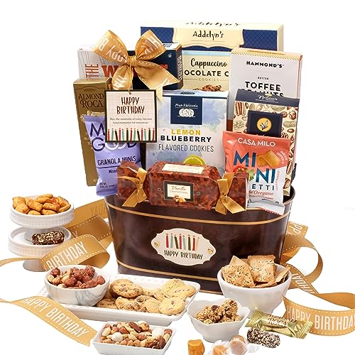 Broadway Basketeers Happy Birthday Gift Basket with Chocolates & Sweets Send Happy Birthday Wishes With This Beautiful Display Basket Enjoy a Large Assortment of Sweets & Savory Treats, Perfect for Mom, Dad, Friends