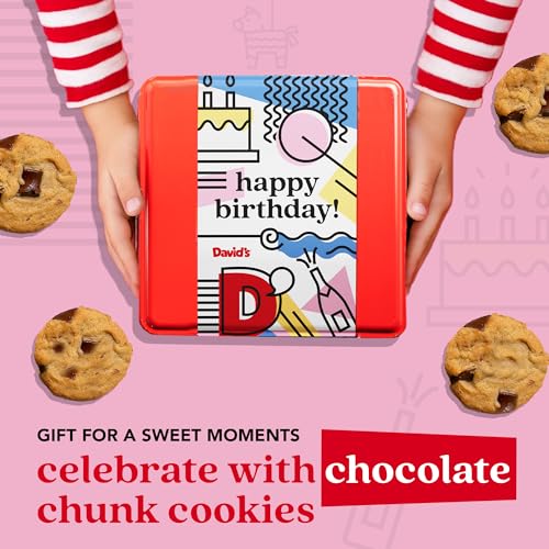 David’s Cookies Happy Birthday Chocolate Chunk Cookies Tin 1lb – Handmade and Fresh Baked Gourmet Cookie Gift Basket – Delectable & Made with Premium Ingredients – Ideal Birthday Food Gift For All