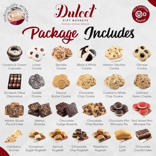 12pc Heart Chocolates, 5 Mini Chocolate and/or Red Velvet Whoopie Pies, 2 Cranberry Scones, 24 Assorted Cookies – flavors include Hamentashen, Crinkle, Chocolate Chip, Peanut Butter, Oatmeal Raisin, Cranberry White Chip, Linzer, Black and White, Chinese, and/or Sprinkle, 1 Cookie and Cream Cupcakes, 2 3oz Blueberry Muffins, 1 Chocolate Crumb Cake, 1 Traditional Pound Cake, 3 Assorted Brownies – flavors include Chocolate Fudge, Chocolate Chip Blondie and/or Walnut, 2 Marble Sliced Pound Cake,