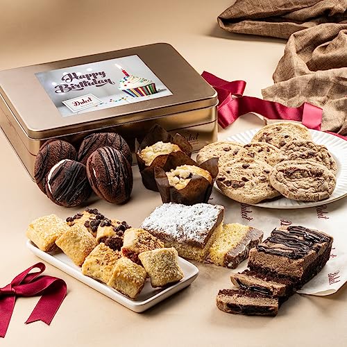 Dulcet Gift Basket Happy Birthday Baked Goods Gift Box – Luxurious Celebration Gourmet Bakery Dessert Party Gift Tin Box with Whoopie Pies, Muffins, Cookies, Crumb Cake, Delicious Pastry for Girlfriend, Mom, Grandfather, Him, and Her