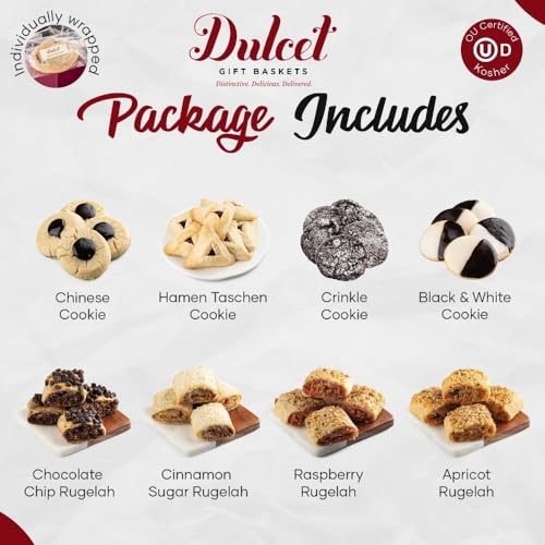 DELIGHTFUL TREATS: This Classic Collection Gift Basket consists of all things sweet. Package features 6 Assorted Cookies – flavors include: Chinese, Crinkle, Black and White, 3 Hamantaschen – flavors include: Raspberry and Prune, and 1/4 Lb. Assorted Rugelah- flavors include: Chocolate Chip, Cinnamon Sugar, Apricot and/or Raspberry.