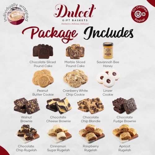 COLLECTION OF BAKED GOODNESS: Box features-1 Marble sliced Pound Cake, 1 Chocolate sliced Pound Cake, 3 Assorted Brownies – flavors include: Walnut, Chocolate Fudge, Chocolate Chip Blondie, and/or Chocolate Cheese, 6 Assorted Cookies – flavors include: Peanut Butter, Cranberry White Chip, and Linzer, 1/2 Lb. Assorted Rugelah – flavors include: Raspberry, Cinnamon Sugar, Chocolate Chip, and/or Apricot, and 1 3oz Savannah Bee Honey.