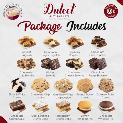 Elegant 3-Tier Gift Tower: Indulge in a delightful assortment with 25 Assorted Cookies, featuring flavors like Black and White, Chocolate Chip, Peanut Butter, Cranberry White Chip, and Oatmeal Raisin. Also includes 1 1/2 Lb. Assorted Rugelah with flavors like Raspberry, Cinnamon Sugar, and/or Chocolate Chip, 2 Chocolate Whoopie Pie, 2 Lemon Whoopie Pie, 4 Crumb Cakes (flavors include Chocolate, Raspberry, and Old Fashioned), & 8 Assorted Brownies (flavors may include Chocolate Chip and/ Walnut).
