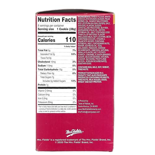 Specification: White Chocolate Macadamia Nut Cookies Soft Baked, Mrs. Fields Cookies with Printable Cookie Salad Recipe. Bundle Includes One Box of 8 Individually Wrapped 1oz cookies, and One Recipe.