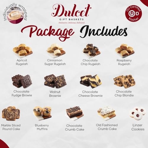 AN ARRAY OF UNIQUE TASTES TO SWOON OVER: Each gift box contains a variety with many different tastes, offering you heaven in each and every bite. 3 Assorted Brownies- Flavors include Chocolate Fudge, Walnut, Chocolate Cheese and /or Chocolate chip blondie, 2 Crumb cakes: Chocolate and Old Fashioned, 2 Marble Sliced Pound Cakes, 2 3oz Blueberry Muffins, 2 Linzer Cookies and 1/2 Lb. Rugelah flavors may include Chocolate Chip, Raspberry, Apricot, and/or Raspberry.